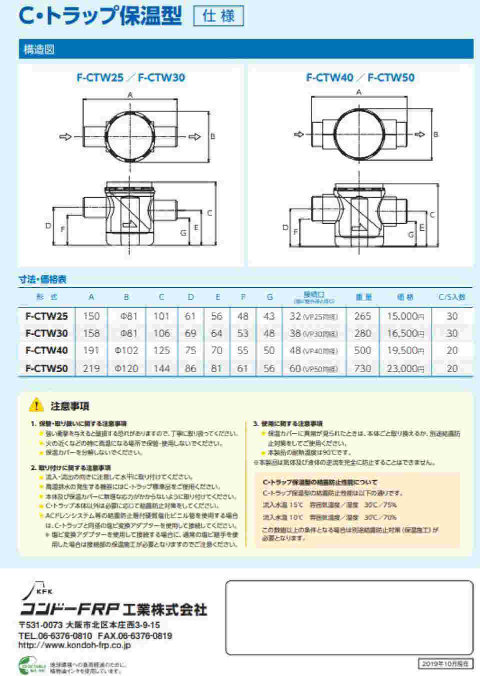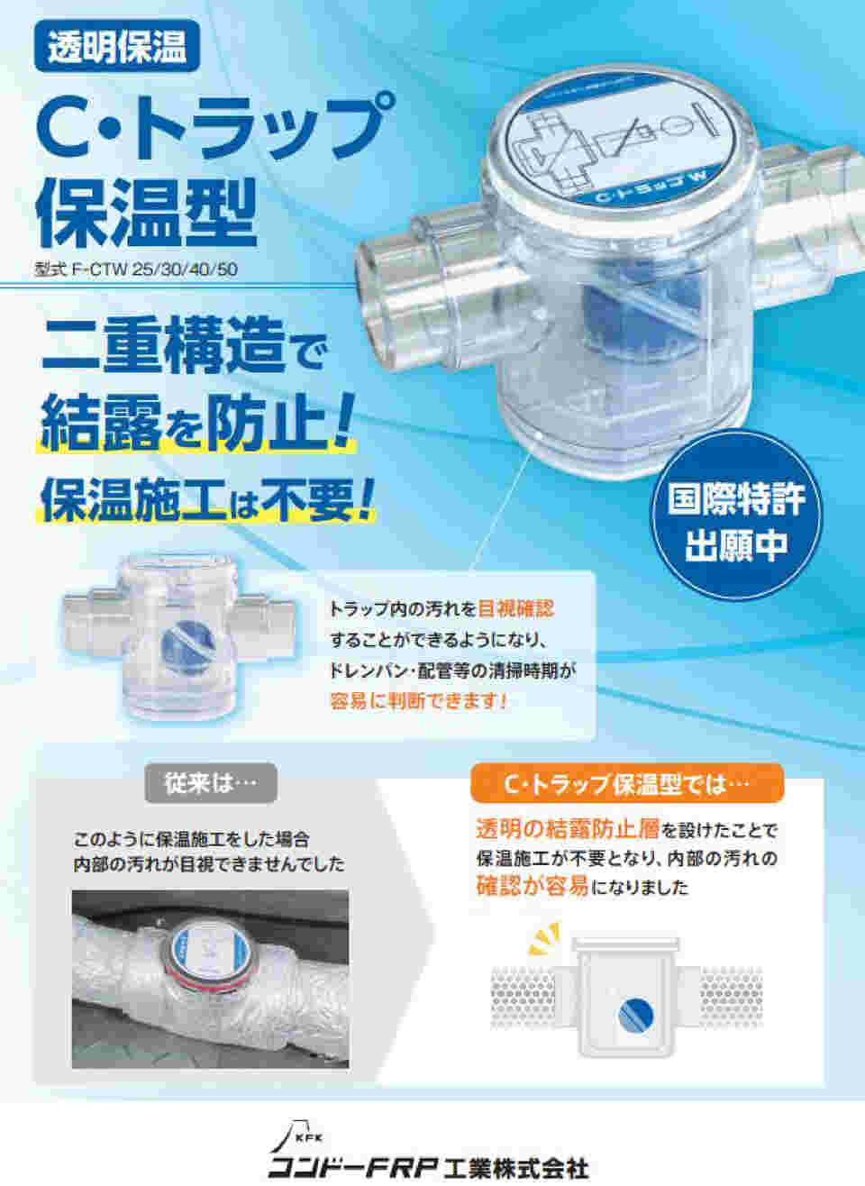 型番 kcトラップ 規格 国土交通省仕様 商品重量(kg) 03 janコード 大ケース入数 30「c・トラップ」を空調機毎に取り付けることによって空気の逆流を 防止し、空気汚染を防止することができます。その他に、自動エアー 抜き弁の排水や電気温水器の膨張水排水等のトラップとして、様々 な用途にご使用頂く事ができます。C・トラップ 保温型 型式 fctw 25/30/40/50 従来は c・トラップ保温型では 透明の結露防止層を設けたことで 保温施工が不要となり、内部の汚れの 確認が容易になりました このように保温施工をした場合 内部の汚れが目視できませんでした 二重構造で 結露を防止 !